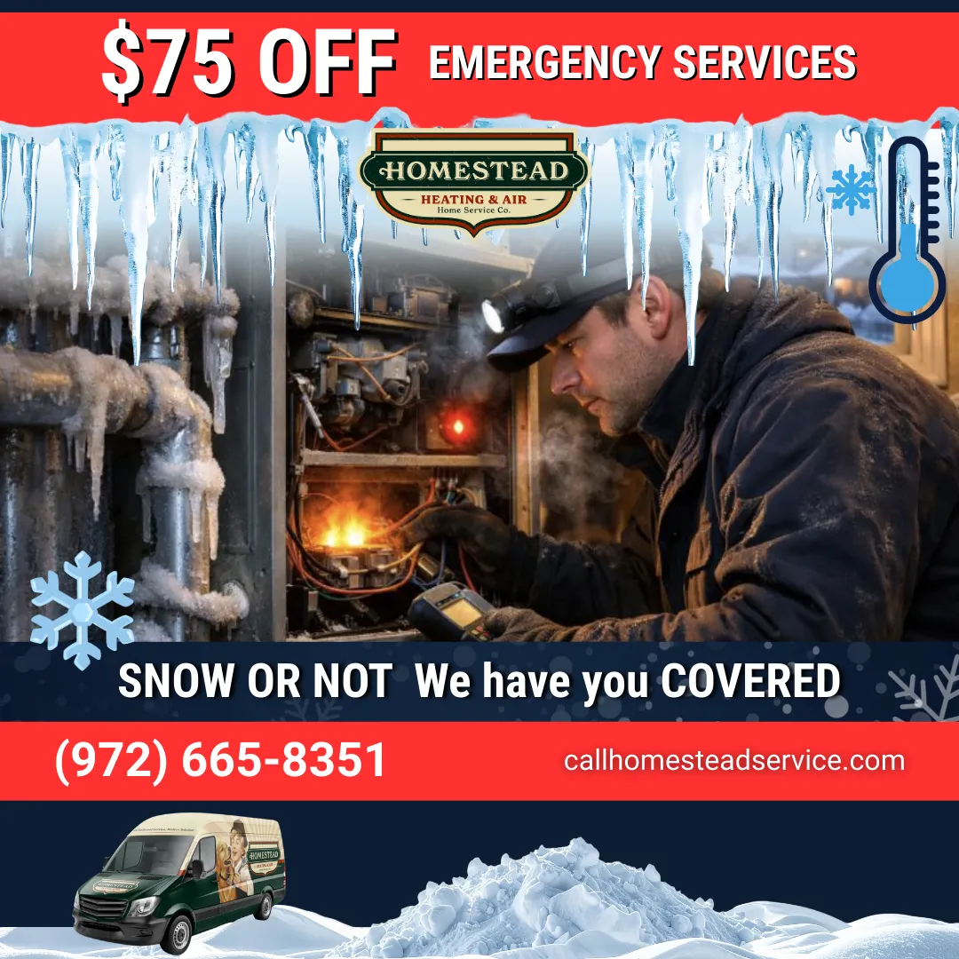 We offer 24/7 emergency heating repair — and right now, take $75 OFF your service call. Book now and get warm fast!